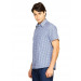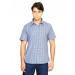 White and blue check shirt made of 100% cotton, has a tipped collar, front buttoned placket, short sleeves, pocket on left chest with embroidered branding and a curved hemline