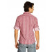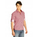 Red and white check shirt with light red accents, made of 100% cotton, has a tipped collar with red inseam, front buttoned placket with red inseam, full length sleeves with buttoned cuffs and mid sleeve buttoned flap, pocket on left chest and a curved hemline