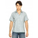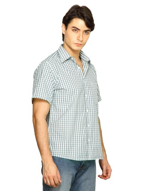 White and dark green check shirt with light green accents, made of 100% cotton, has a tipped collar, front buttoned placket, short sleeves, pocket on left chest and a curved hemline