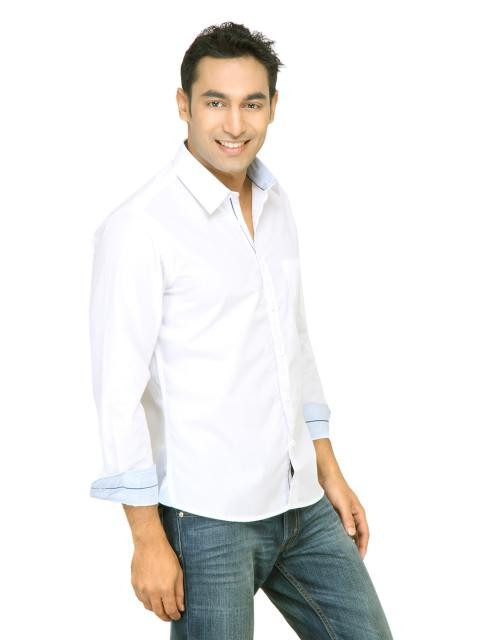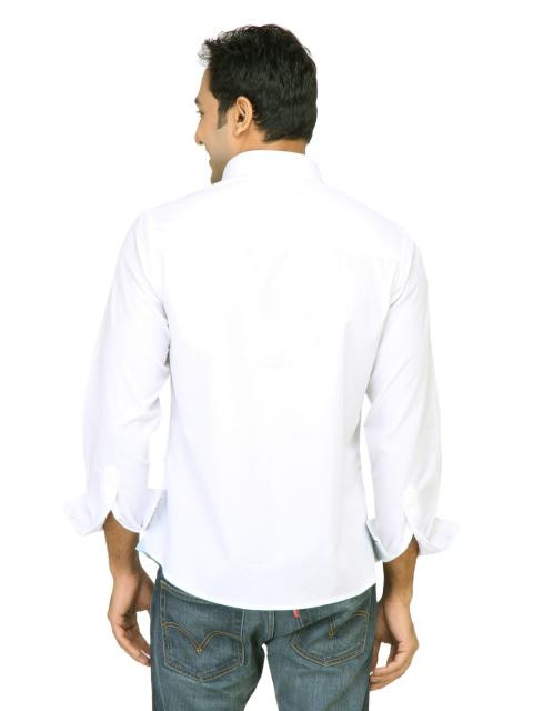 White shirt made of 65% polyester and 35% cotton, has a spread collar, full sleeves with buttoned cuffs, a full-length buttoned placket, chest pocket, and a curved hemline