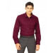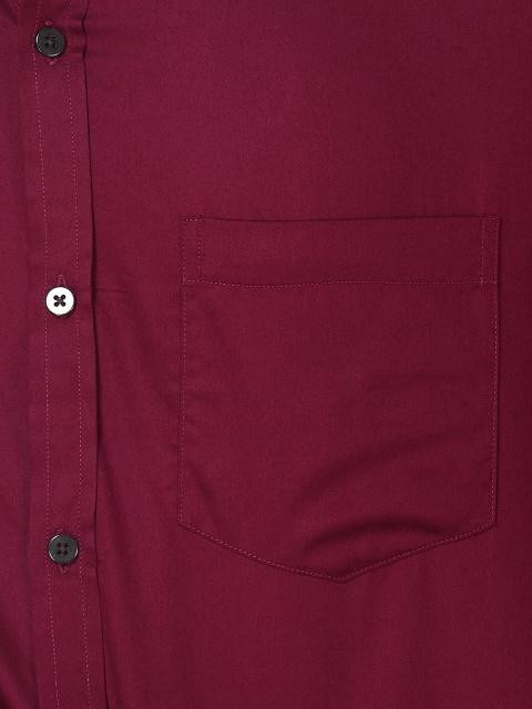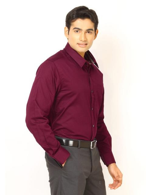 Purple shirt made of 100% cotton, has a tipped collar, front buttoned placket, full length sleeves with buttoned cuffs, pocket on left chest and a curved hemline