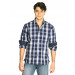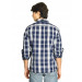 Navy blue and white broad check shirt with light navy accents, made of 100% cotton, has a tipped collar with a black inseam, front buttoned placket, full length sleeves with buttoned cuffs, pocket on left chest and a curved hemline