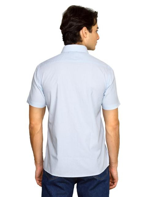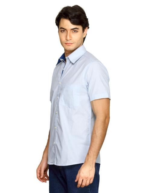 Light blue shirt made of 100% cotton, has a tipped collar with a dark blue inseam, front buttoned placket with dark blue inseam, short sleeves, pocket on left chest and a curved hemline