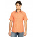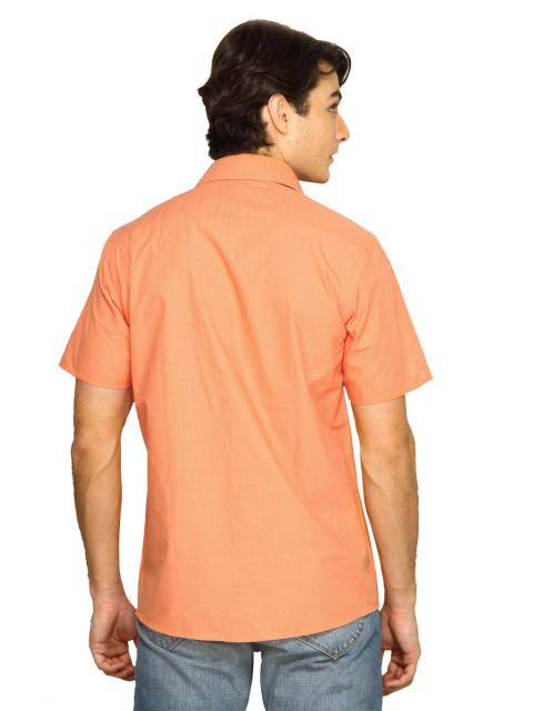 Orange shirt made of 100% cotton, has a tipped collar with a black inseam, front buttoned placket with black inseam, short sleeves, pocket on left chest and a curved hemline