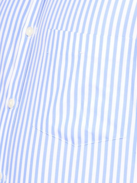 White shirt with light blue stripes, made of polycot, has a tipped collar, front buttoned placket, full length sleeves with buttoned cuffs, pocket on left chest and a curved hemline