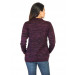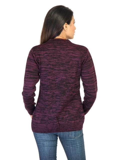 Purple and black cardigan made of 100% acrylic, has three-quarter sleeves that have ribbed hems, and a three-buttoned enclosure holding the two sides of the neckline in place