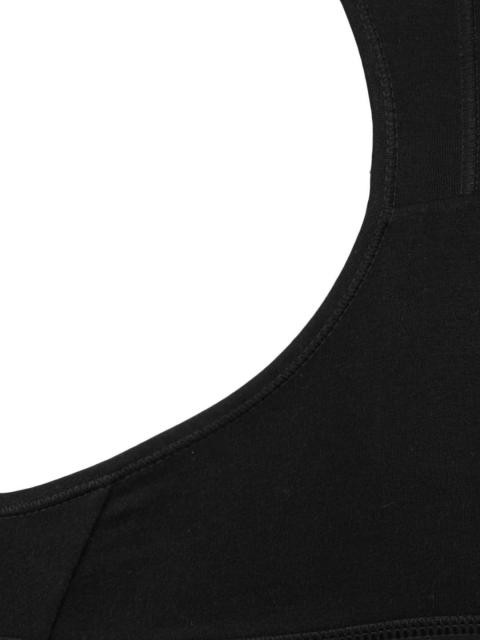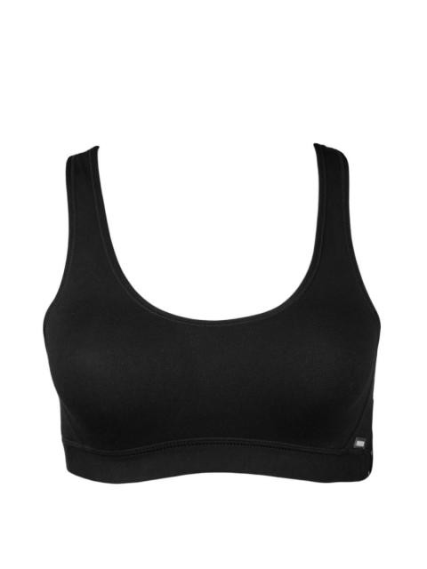 Black sports racerback bra, has soft moulded seamless cups, modern styling with wider armholes which provide freedom of movement and excellent Fit, double layered cups and soft bottom band which helps to keep bust in place, soft cushioned hook and eye and wider straps for extra support and comfort