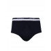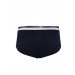 Navy blue classic brief, has a Y-front fly opening, high rise waistline, contoured leg opening for freedom of movement, unique double layered fly construction for optimum comfort and support, new high-tech cushioned waistband for smooth and comfortable grip with branding