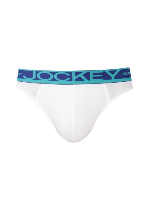 A pair of white briefs, has an elasticated waistband with branding, double-layered pouch on the front, elasticated leg openings, Quick Dry fabric, modern fit with sport support, reinforced seams, durable sports fit elastic, mesh inserts for increased moisture management