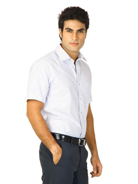White half sleeves shirt with blue checks, made of 60% polyester, 30% cotton and 10% linen, has a patch pocket on the left chest, rolled cuff, full length buttoned placket and curved hemline