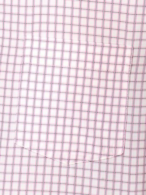 White and pink check shirt with black accents, made of cotton-polyester blend fabric, has a tipped collar, front buttoned placket, full arm sleeves and pocket on left chest
