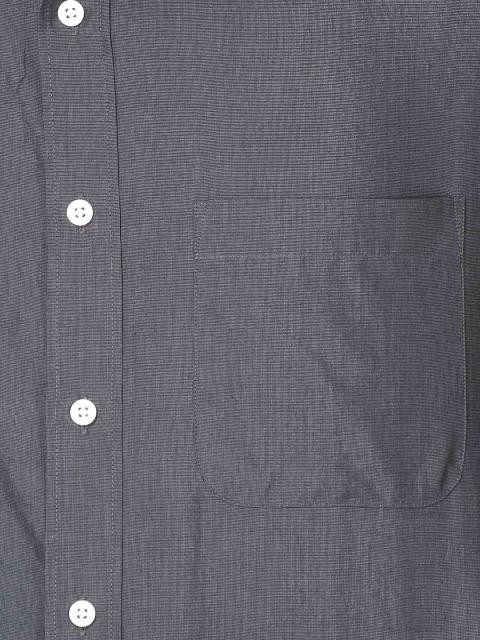 Grey shirt made of a polyester-cotton blend fabric, has a tipped collar, front buttoned placket, full arm sleeves with buttoned cuffs and pocket on left chest