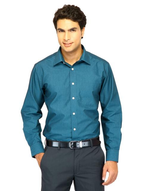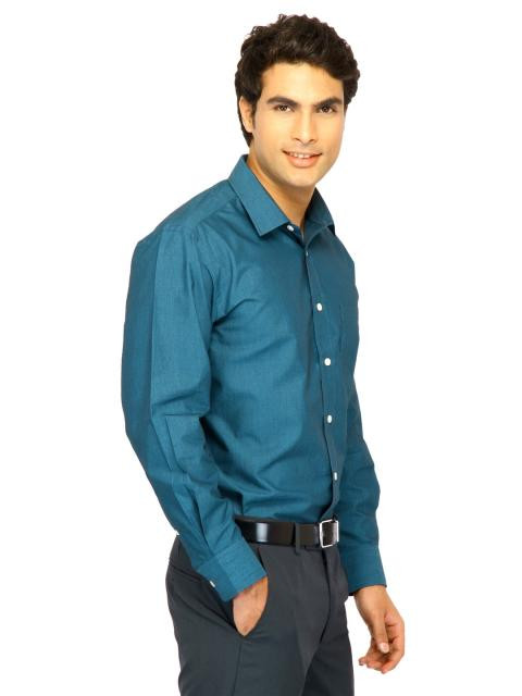 Peacock blue full sleeved shirt, made of 100% cotton, has a patch pocket on the left chest, full length buttoned placket and brand initials embroidered on the right cuff