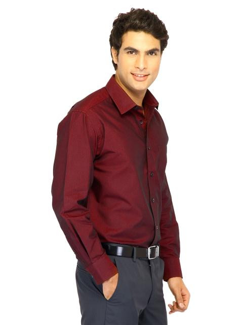 Dark maroon full sleeved shirt, made of 100% cotton, has a patch pocket on the left chest, full length buttoned placket and brand initials embroidered on the right cuff