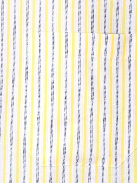 White shirt with blue and yellow stripes, made of cotton-polyester blend fabric, has a tipped collar, front buttoned placket, full arm sleeves and pocket on left chest