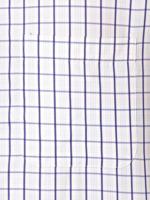 White and dark blue check shirt made of polyester-cotton blend fabric, has a tipped collar, front buttoned placket, full arm sleeves and pocket on left chest
