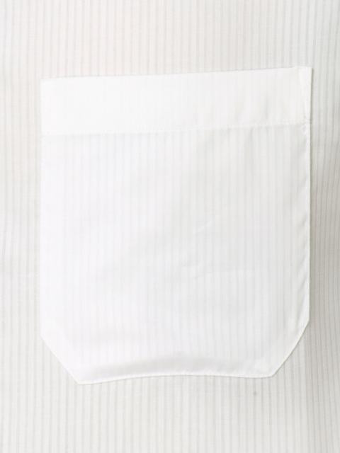 White shirt made of polyester-cotton blend fabric, has a tipped collar, front buttoned placket, full arm sleeves with buttoned cuffs and pocket on left chest