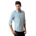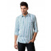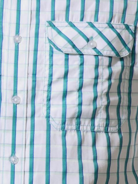 White and blue checked shirt, made of cotton fabric, has a spread collar, long sleeves with buttoned cuffs, full buttoned placket, buttoned flap pockets on the front and a curved hem