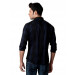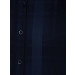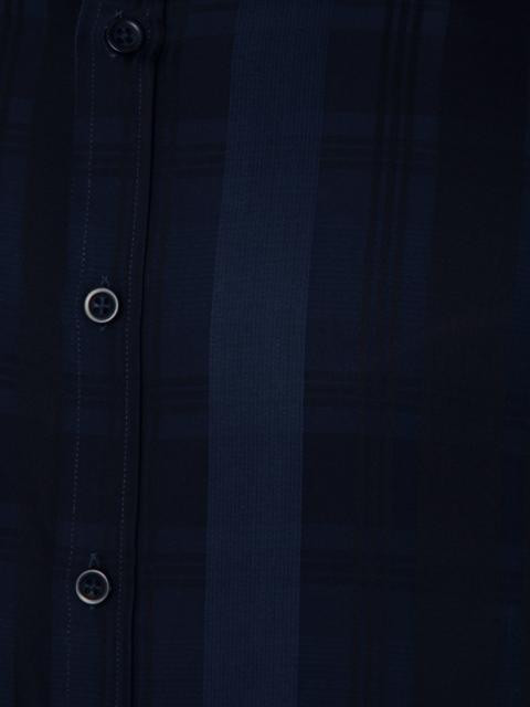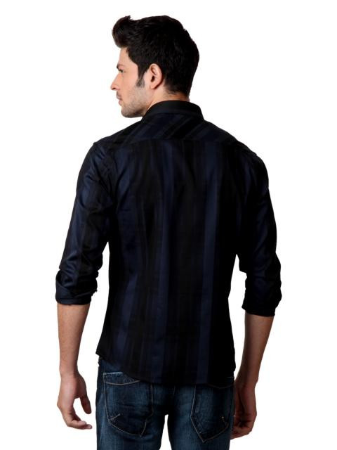 Navy blue striped woven shirt, has a spread collar, long sleeves with buttoned cuffs, full button placket and a curved hem