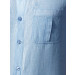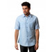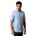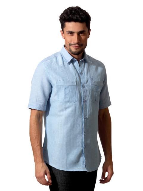 Sky blue coloured casual shirt with white vertical stripes, full buttoned placket, a spread collar and short sleeves