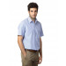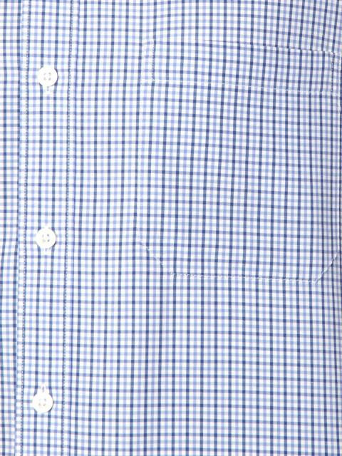White shirt with blue checks, has a spread collar, a patch pocket on the left chest, a buttoned placket, short sleeves with a curved hem