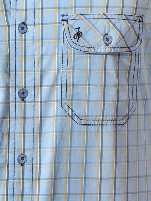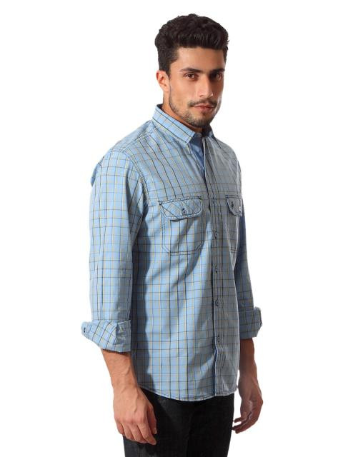 Blue and yellow checked shirt made of 100% cotton, has a spread collar, long sleeves with buttoned cuffs, full buttoned placket, pockets on the front with buttoned flaps, embroidered branding on the left chest pocket and a curved hem