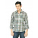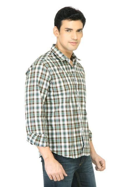Green, brown and white check shirt with blue and fluorescent accents, made of 100% cotton, has a spread collar, full front buttoned placket, patch pocket on the left chest, full sleeves with buttoned cuffs and a tailored hem