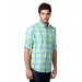 Green gingham shirt with blue stripes, has a spread button-down collar, embroidery on the left chest, full sleeves with buttoned cuffs, a buttoned placket and a curved hem