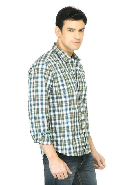 Dark green, navy blue and white check shirt with light green and pink accents, made of 100% cotton, has a spread collar, full front buttoned placket, patch pocket on the left chest, full sleeves with buttoned cuffs and a tailored hem