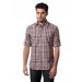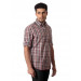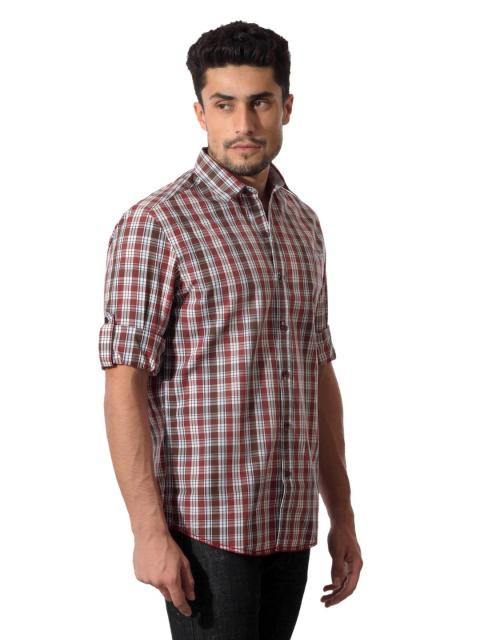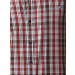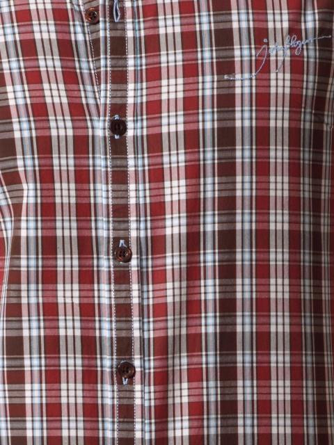 Red and brown check shirt with a spread collar, embroidery on the left chest, buttoned placket, full sleeves and a curved hem