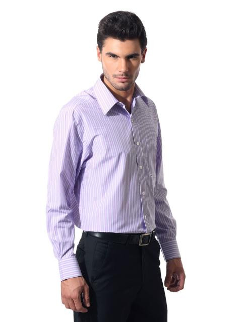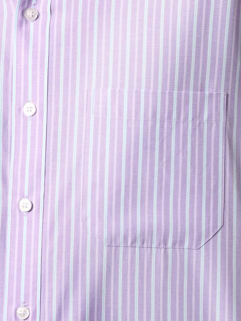 Striped shirt in lavender and mint, has a spread collar, patch pocket on the chest, a buttoned placket, full sleeves with two button cuffs and a curved hem