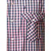 Blue and pink checked shirt made of 100% cotton, has a spread collar, short sleeves, full buttoned placket, pockets on the front with buttoned flaps, embroidered branding above the left chest pocket and a curved hem