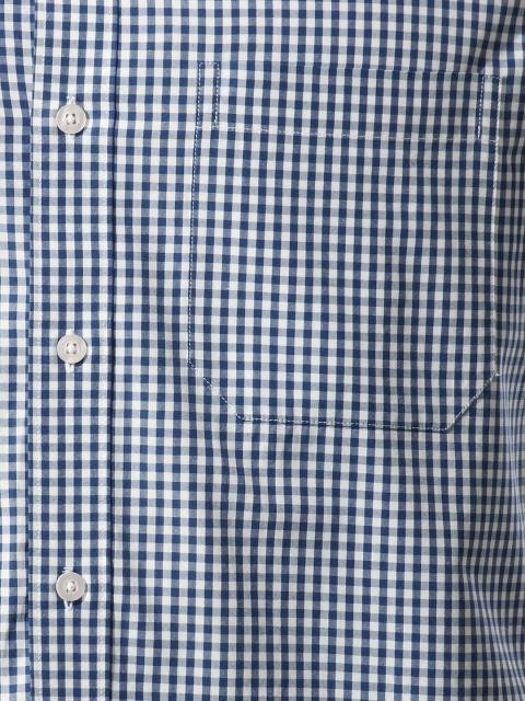 Shirt with blue and white checks, has long sleeves, buttoned cuffs, a spread collar, full buttoned placket, and a patch pocket on the left chest