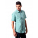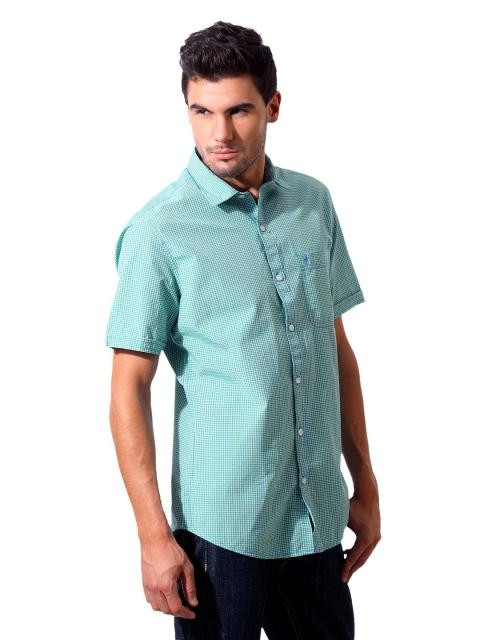 Blue and green checked shirt made of cotton fabric, has a spread collar, short sleeves, full buttoned placket, a patch pocket on the left chest, brand embroidered on the left chest pocket and a curved hem