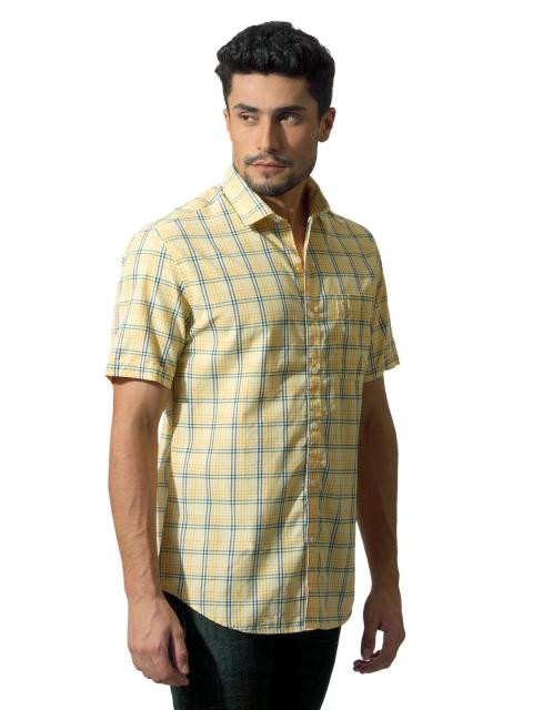 Yellow and green checked shirt, made of 100% cotton, has a spread collar, short sleeves, a patch pocket on the left chest with embroidered branding on the pocket and a curved hem