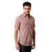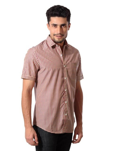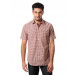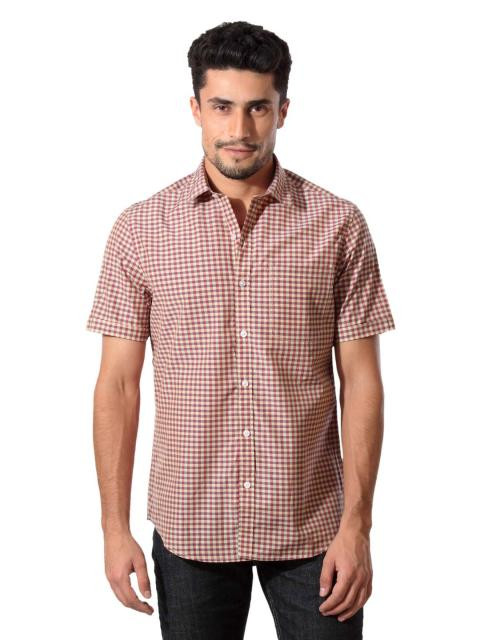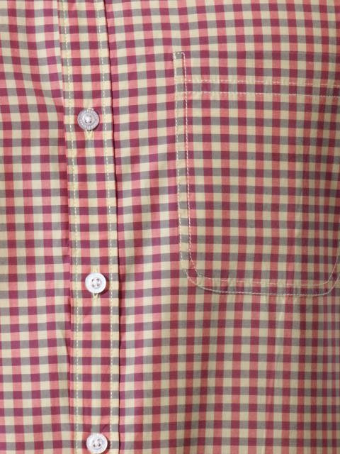 Beige and pink check shirt with a spread collar, a patch pocket on the left chest, short sleeves and a curved hem