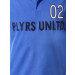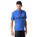 Blue polo neck T-shirt, has short sleeves with ribbed cuffs, chest buttoned placket, applique on the front and a vented hem