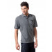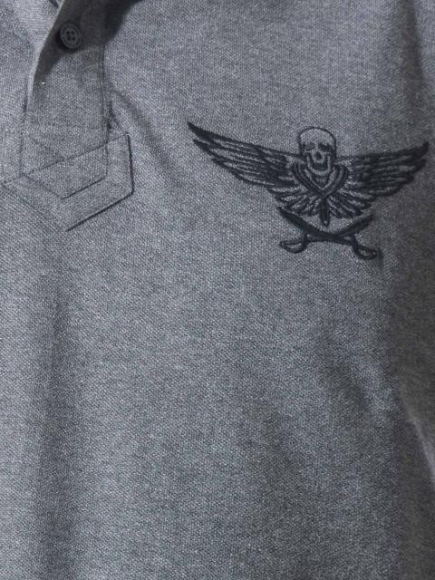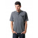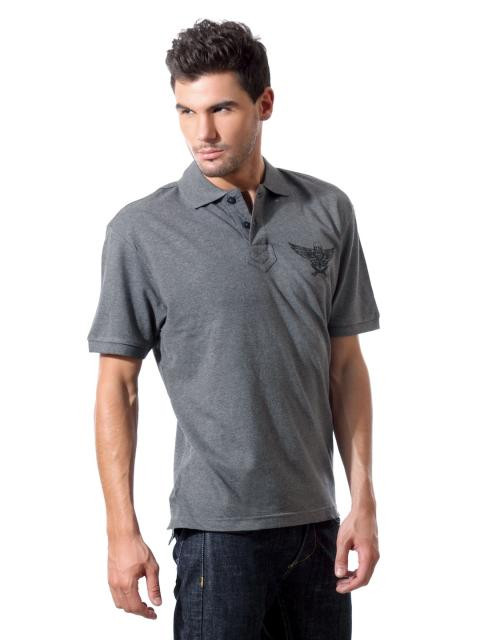 Grey polo neck T-shirt, chest buttoned placket, has short sleeves with ribbed cuffs, applique on the left chest and a vented hem