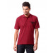 Red polo neck T-shirt, chest buttoned placket, has short sleeves with ribbed cuffs, applique on the left chest and a vented hem