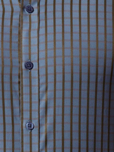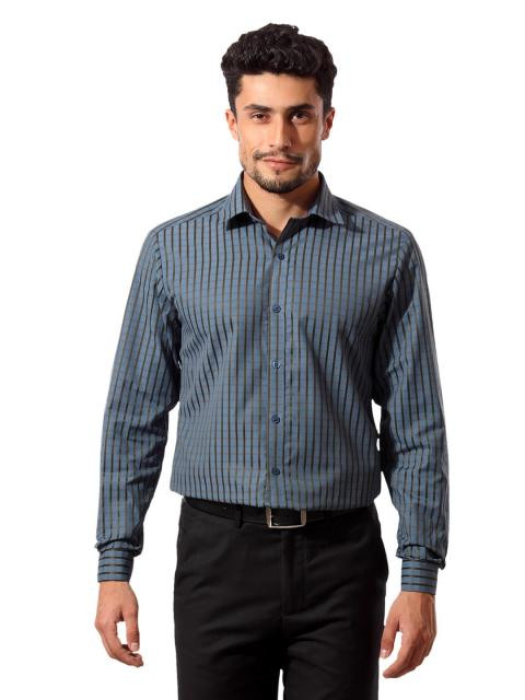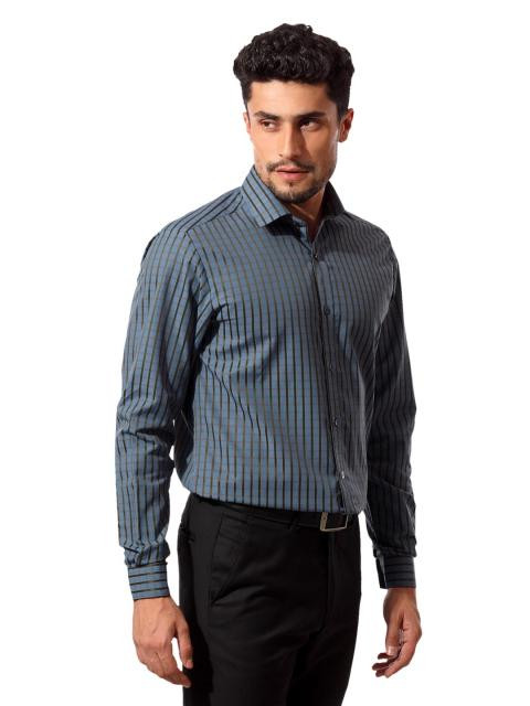 A dark blue shirt with dark green solid vertical stripes and greyish horizontal stripes made of rich cotton, has a medium spread collar, full buttoned placket with long sleeves and buttoned cuffs