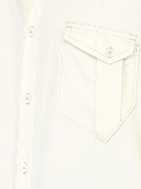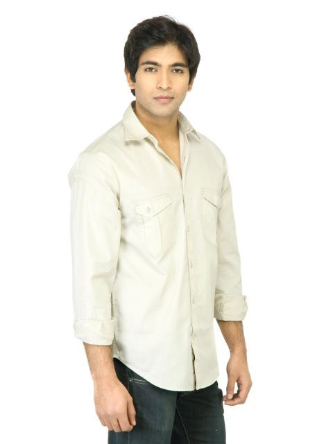 Beige shirt made of 100% cotton, has a spread collar, full front buttoned placket, buttoned flap pockets on either chest, full sleeves with buttoned cuffs, stitch detailing and a tailored hem
