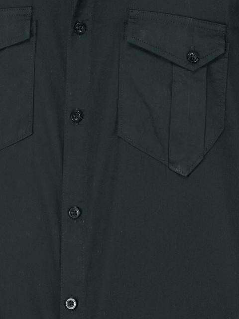 Black shirt made of 100% cotton, has a spread collar, full front buttoned placket, buttoned flap pockets on either chest, full sleeves with buttoned cuffs and a tailored hem