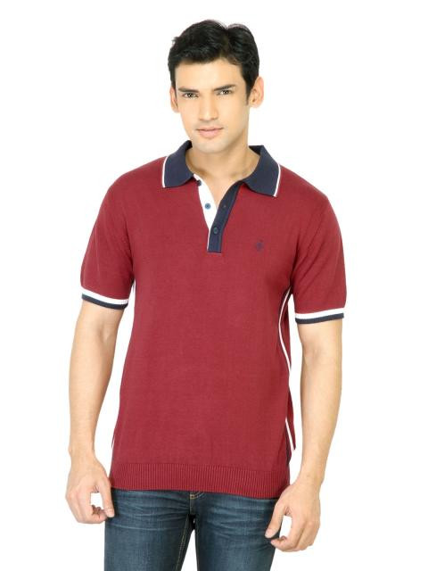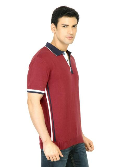 Maroon T-shirt made of 100% cotton knit, has a ribbed collar in navy blue with white and red tipping, three-button chest placket, short sleeves with ribbed cuffs in navy blue and white, navy blue and white lines running down the side length and a ribbed hem