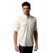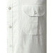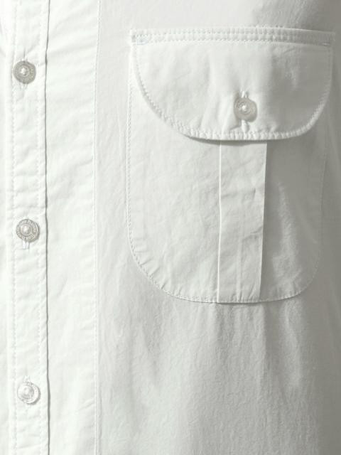Off white shirt with a mandarin collar, two pockets on the chest, embroidered branding on the left chest, long sleeves, a buttoned placket and a curved hem