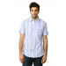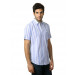 White shirt with blue stripes, has a short spread collar, a patch pocket on the left chest, short sleeves with a buttoned tab at the cuffs, a buttoned placket and a curved hem