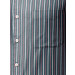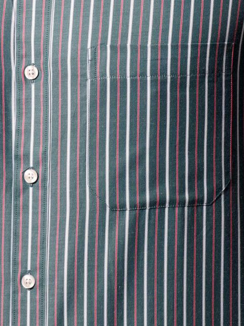 Greyish green shirt with alternate red and white bordered vertical stripes, has a medium spread collar, long sleeves, full buttoned placket, buttoned cuffs and a patch pocket