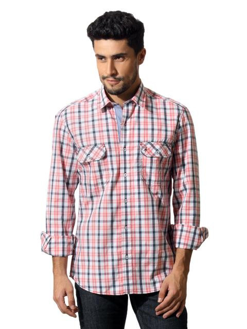 White shirt with grey and peach checks, has a spread collar, two patch pockets on the chest with buttonable flaps, a buttoned placket, full sleeves with buttoned cuffs and a curved hem