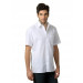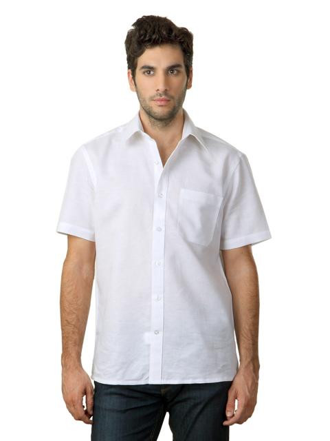 White shirt with a spread collar, a patch pocket on the left chest, half sleeves, a buttoned placket and a curved hem