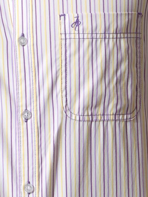 White shirt with purple and yellow stripes, made of 100% cotton, has a spread collar, short sleeves, a patch pocket on the left chest with embroidered branding on the pocket and a curved hem