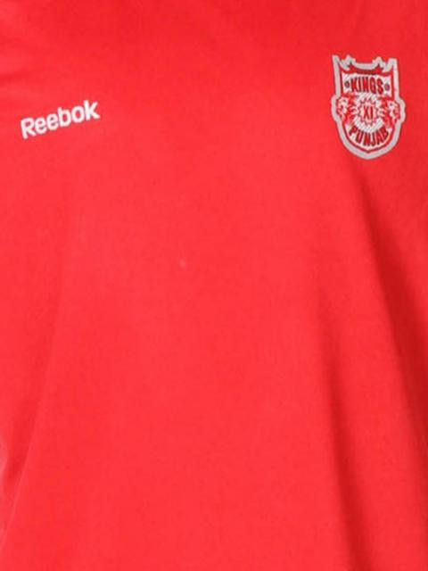 Red jersey T-shirt, has a round neck, short sleeves, branding on right chest and Punjab Kings logo on left chest